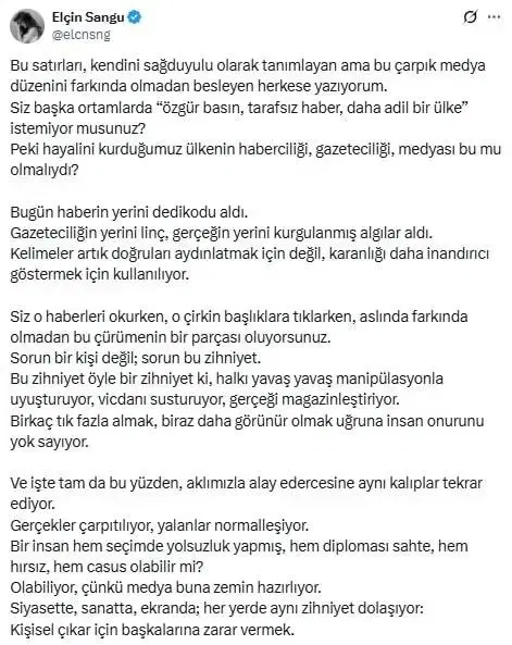 Ünlü oyuncu Elçin Sangu, sosyal medya hesabından yaptığı paylaşımda medya düzenine ve yanlış bilgilendirmelere sert sözlerle tepki gösterdi. Sangu, haberciliğin yerini dedikodu ve manipülasyonun aldığını belirterek “Gerçekler çarpıtılıyor, yalanlar normalleşiyor” ifadelerini kullandı.