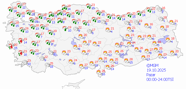 Meteoroloji Genel Müdürlüğü tarafından yapılan tahminlere göre: Ülkemiz genelinin parçalı yer yer çok bulutlu, Marmara’nın güney ve doğusu, Ege (Muğla hariç), İç Anadolu’nun kuzeyi, Batı ve Orta Karadeniz, Doğu Karadeniz kıyıları ile Aksaray, Niğde, Nevşehir, Kırşehir, Artvin çevreleri, Adana’nın ve Osmaniye’nin güneyinin yağmur ve sağanak yağışlı geçeceği tahmin ediliyor. Yağışların; Batı Karadeniz, Sakarya’nın kuzey ve doğu kesimleri, Ordu, Giresun, Rize çevreleri, Samsun ve Trabzon’un doğusunda yerel kuvvetli olması bekleniyor.