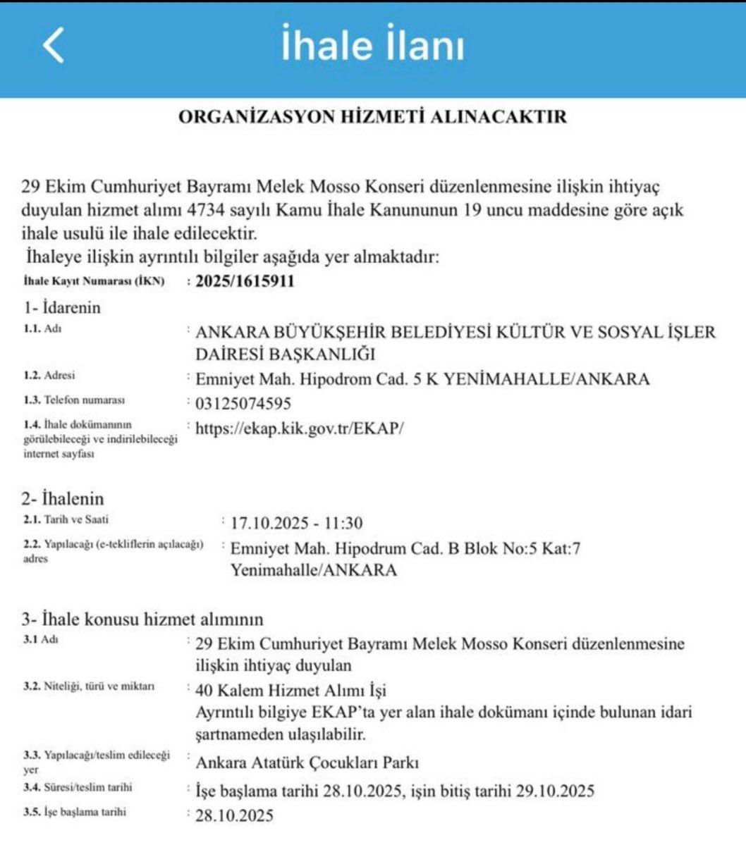 Ankara Büyükşehir Belediyesi, 2021-2024 döneminde konser harcamalarıyla ilgili yaşanan skandalın ardından hala konser düzenlemeye devam ediyor. Geçtiğimiz günlerde Melek Mosso konseri için yeni bir ihale açıklandı